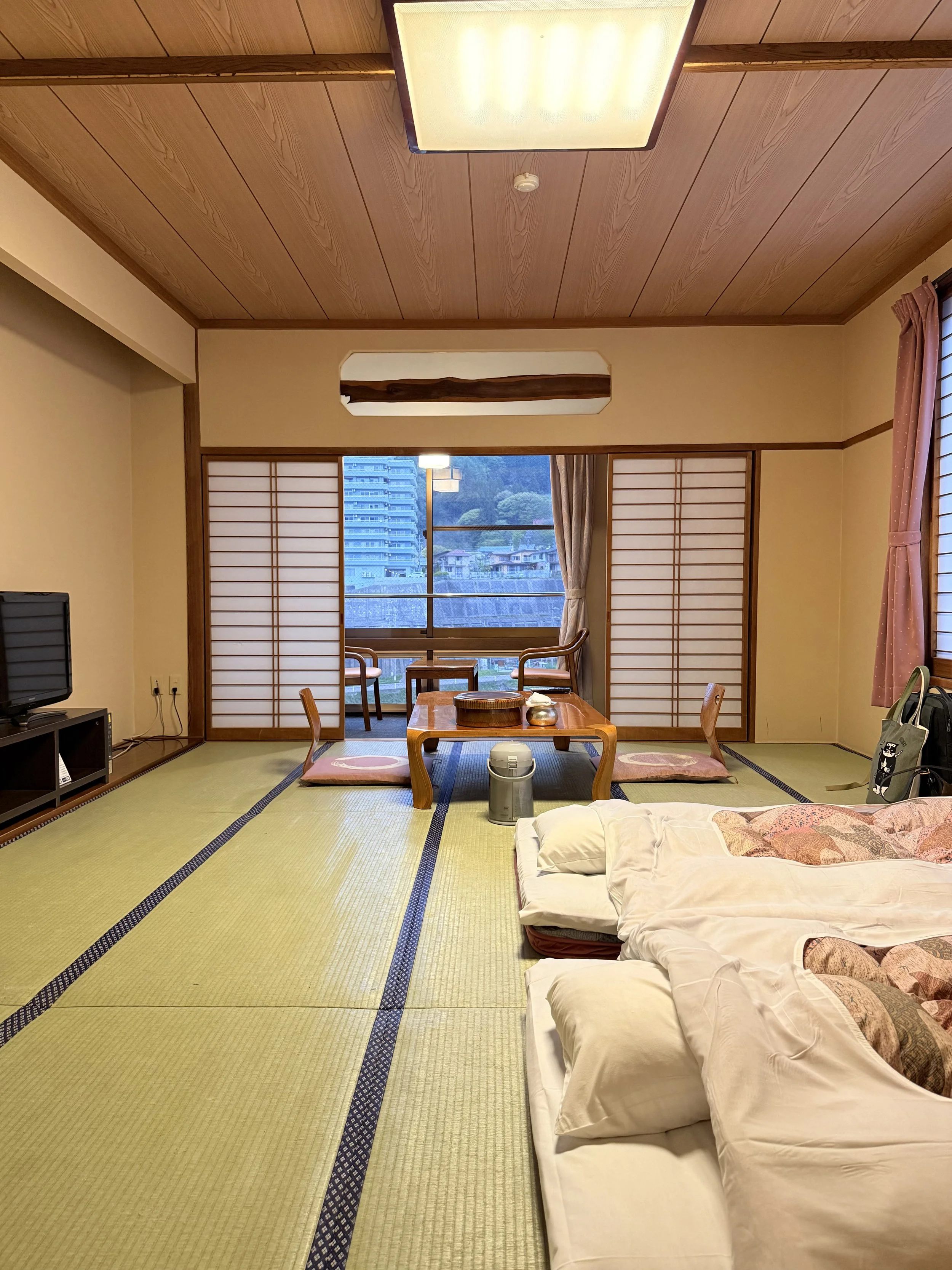 Our ryokan had tatami floors, futon beds, and green tea waiting for us. Dinner was mostly seafood, so if you’re not a fan, be prepared. The onsen was open 24/7—a perfect way to relax after a long day.
